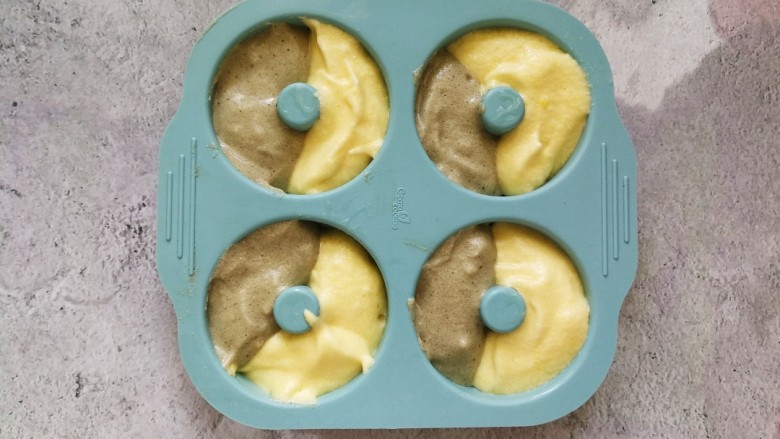 15. 两种面糊用勺子对半舀进模具8分满,轻震模具震出大气泡