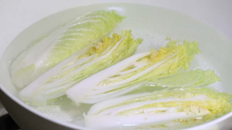 4. 水中加些许盐和油,水沸放入娃娃菜焯水十秒中,立马捞出。