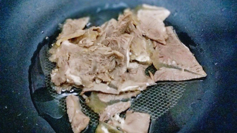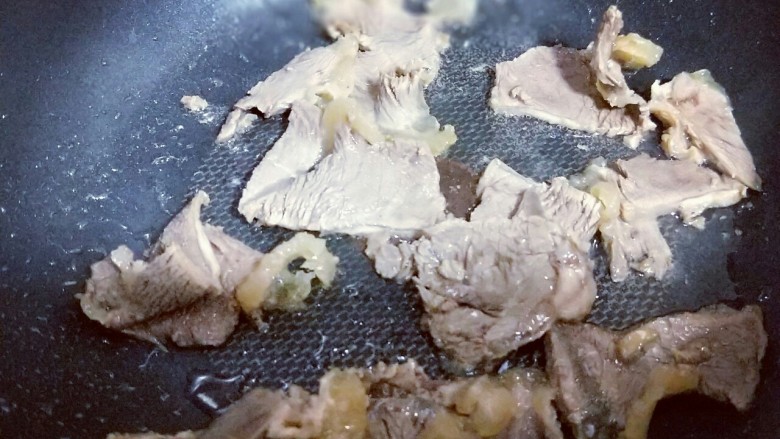 7. 起油锅,加入切好的牛肉片煸炒。
