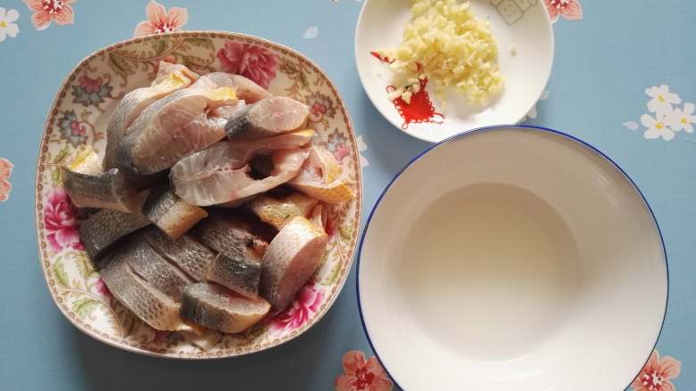 3. 原料来个小集合吧,切好的小黄鱼段,蒜切碎,水淀粉,我用的是玉米淀粉,水淀粉不需要要稀一点。