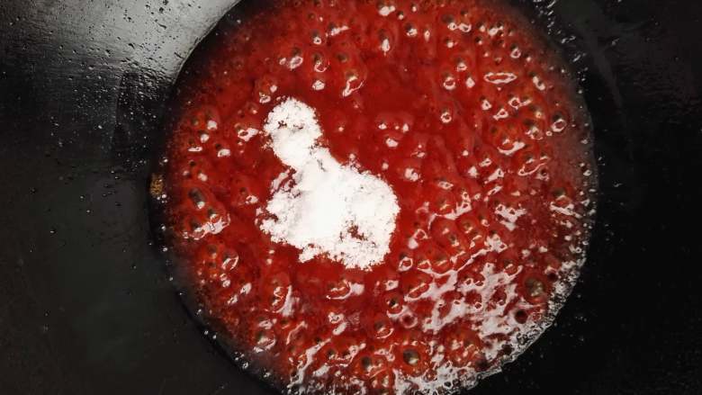8. 咕咾汁越来越浓稠,加入白糖,继续熬制。甜和酸的口感要看自己的口味来调。