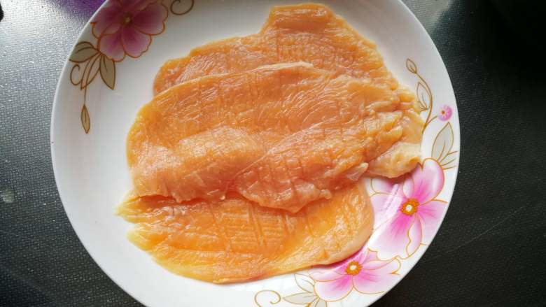 1. 鸡胸肉洗净切成1厘米左右厚的片,用刀背在鸡肉正面反面敲打。使鸡肉松散。