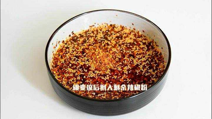 8. 碗变凉后倒入剩余的辣椒粉,搅拌均匀就好了。