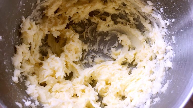 1. 黄油软化,加糖粉搅拌均匀,打发至蓬松状态