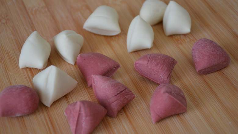 25. 将切开的两个花卷立起来,这样就是两朵漂亮的玫瑰花,每个玫瑰花馒头生胚约46g左右。这是粉色花瓣在外面的玫瑰花馒头。