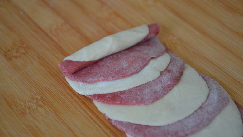 17. 擀皮,不用太薄,不然玫瑰花不好看。做玫瑰花需要七张面皮,取四张粉色面皮和三张白色面皮。