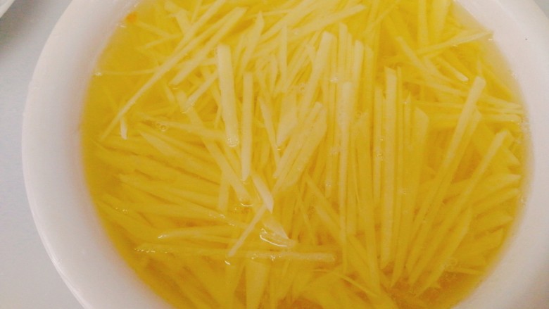 4. 再将土豆片切成细丝,将切好的土豆丝泡去淀粉,(这样炒出的土豆丝清爽不粘)。