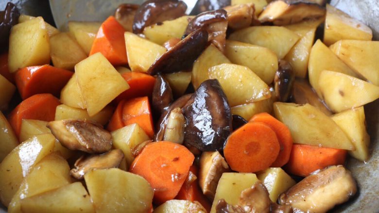 14. 加入适量的清水;不可加多,土豆熟的块,炖时间久了就化了;