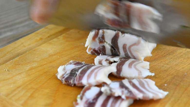 7. 锅里倒入一勺油,油温5成热,放入咸肉煸炒出油。
