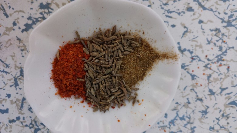 1. 先准备调料,放一勺孜然粉