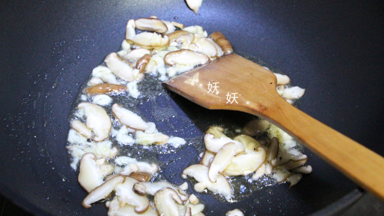 7. 油锅烧热,下蒜末和香菇炒香。