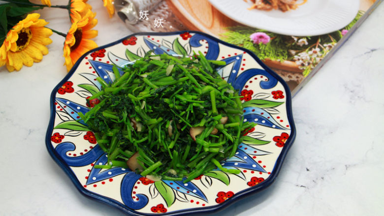 8. 下红花草进去翻炒,很容易就炒熟。
