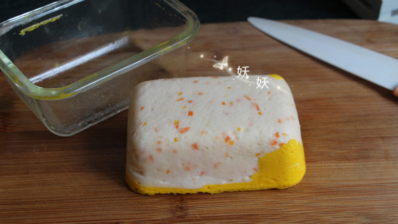 13. 倒入蛋黄液。继续盖上保险膜,再蒸5分钟。