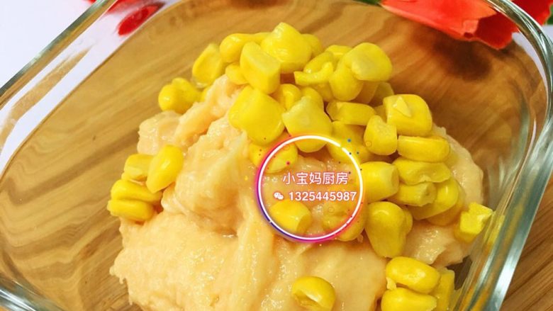 5. 打好的肉泥加玉米粒拌匀;盛到刷好植物油的香肠模具中;