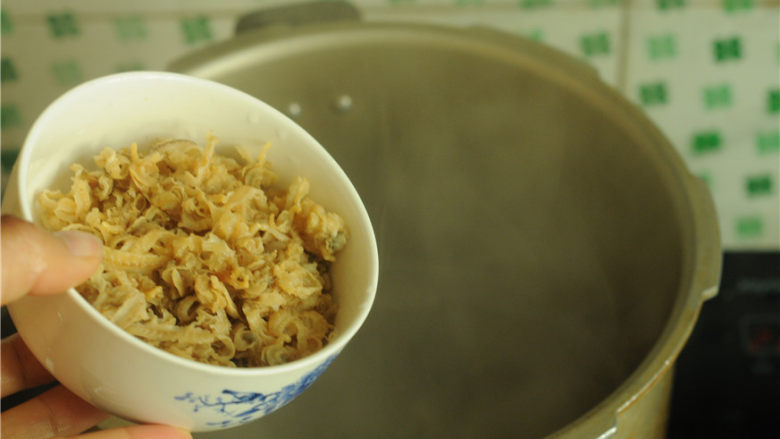 10. 打开高压锅,将腐竹放进去,再次煮开后烧一分钟