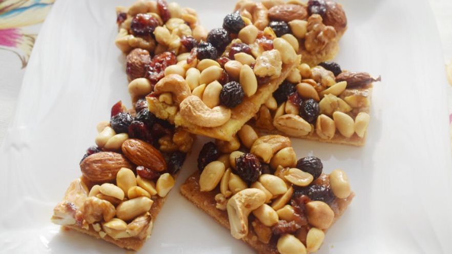11. 把坚果混合物均匀的铺在刚才烤好的薄片上。