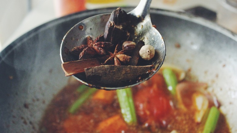 11. 加水,没过食材。并加速香葱结、盐,、味极鲜、老抽调味调色。大火烧开后转小火卤制两小时,关火焖制两小时。(卤制成功后洋葱和香葱及西红柿基本融化入汤)