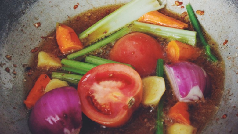 7. 继续用炸肉的油,将西红柿,芹菜段,姜块,胡萝卜块,入油锅,(一直中大火)
