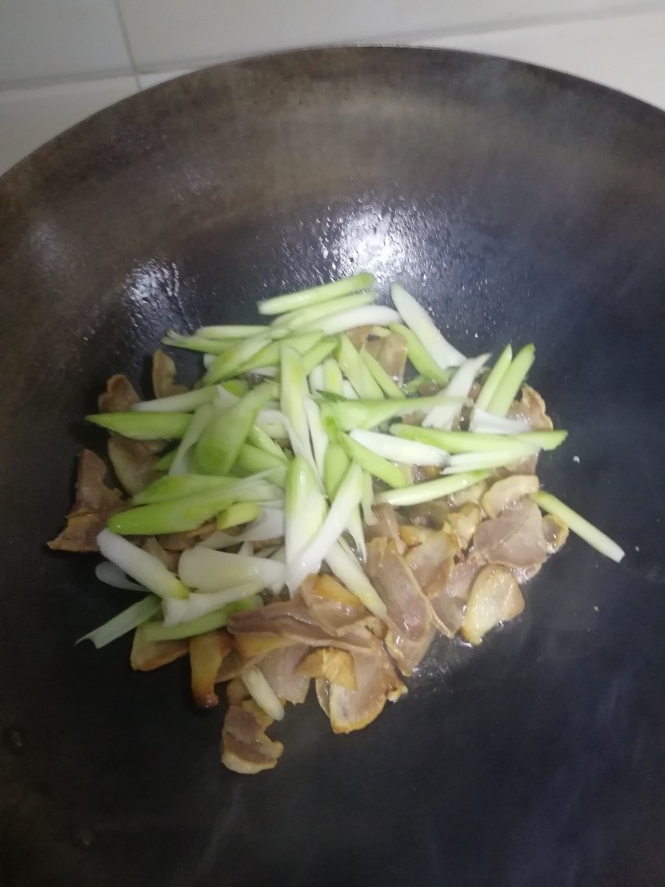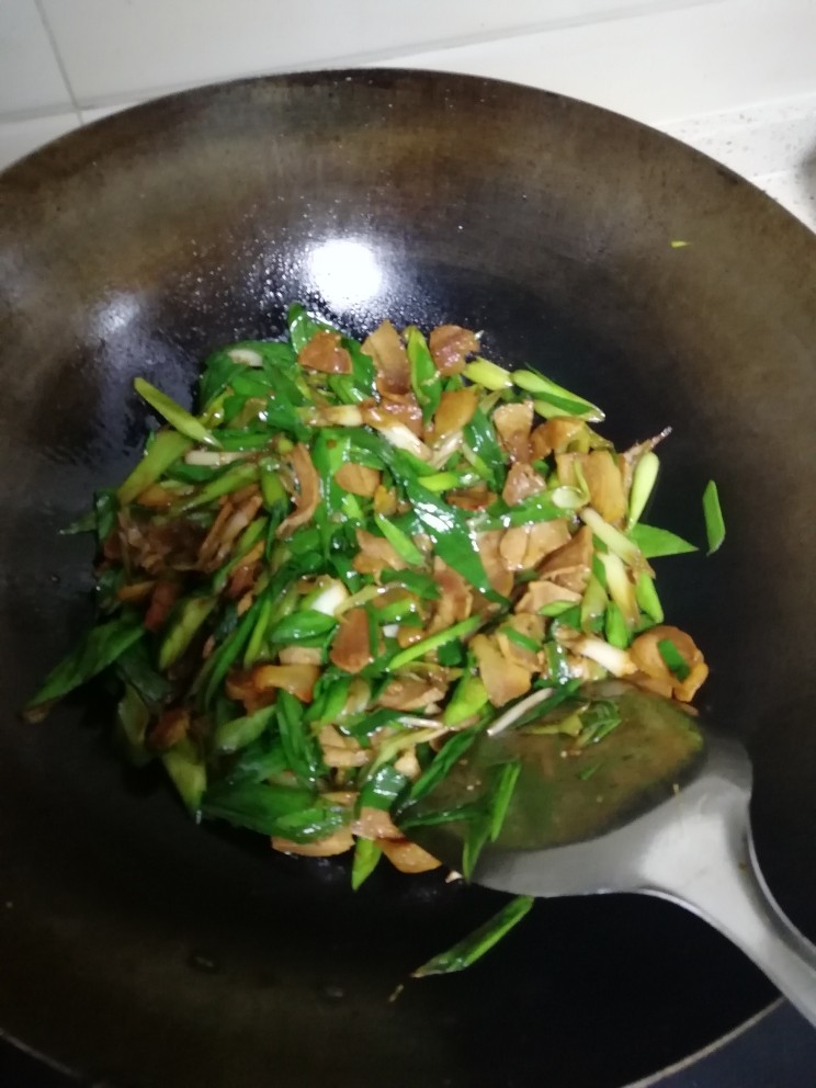 8. 将大蒜和咸肉翻炒在一起,加入鸡精