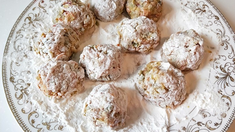 3. 做成圆形丸子,放入淀粉盘中打一裹,沾均匀即可。