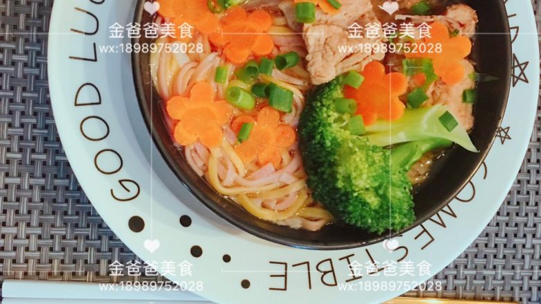 7. 排骨煮好后放入适量盐➕糖调味 面放面放碗里 倒入排骨汤和排骨 然后摆上西兰花胡萝卜就好了!