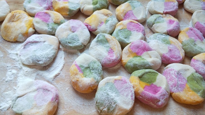 18. 四种面团搓成饺子大小的长剂子,在合拢一起。