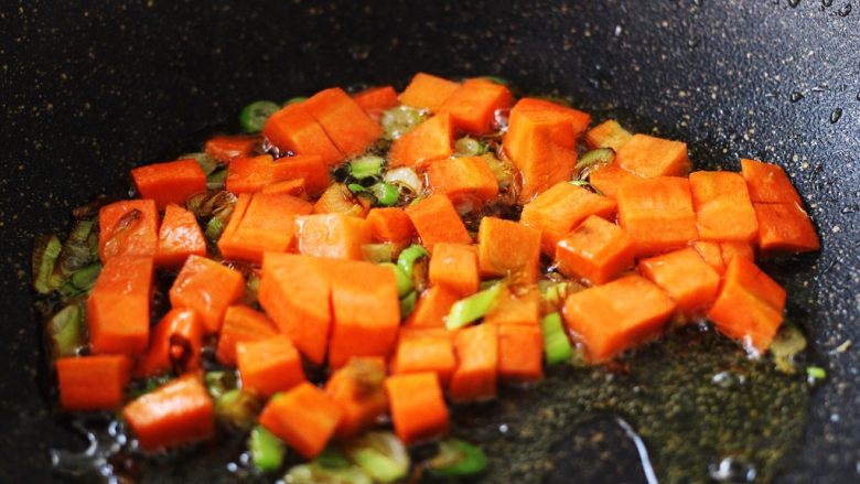 9. 热锅倒入花生油烧至六成热时、爆香葱花