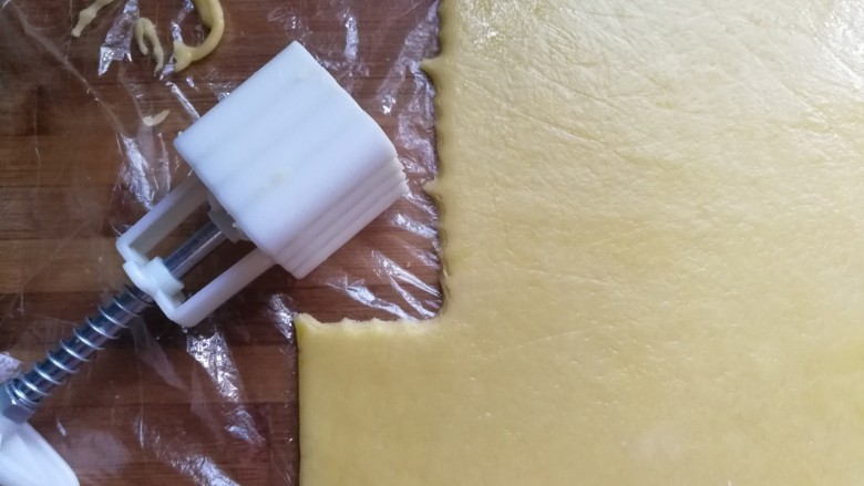 8. 擀好后将保鲜膜剪开,用饼干模具或月饼模具开始压模(有饼干模具最好,我没有印花饼干模具,就用月饼模具代替)