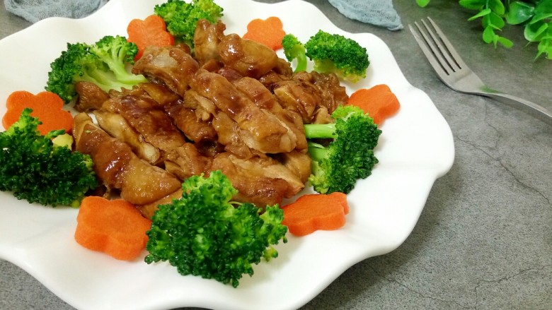 16. 切好的烧鸡腿摆盘,将焯熟的西兰花,胡萝卜一起摆盘就完成了。