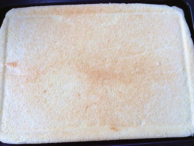17. 取烤盘,铺上油纸倒入蛋糕糊抹平,端起烤盘镇出气泡