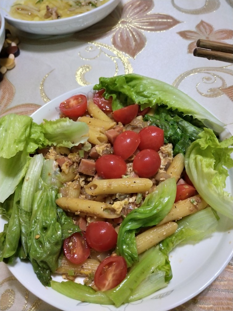 8. 中间没来得及拍照片,文字说明吧~ 蔬菜炒香后,倒入煮好的通心粉,煸炒几下后,倒一点水,转小火。 少许(5g左右)盐,酱油,黑胡椒粉,黑胡椒酱,番茄酱,加一点水搅匀,倒入锅中。翻炒均匀,汤汁收浓,盛入盘中。 小番茄对半切开,放入盘中(懒得摆盘了),生菜切成段,可以过个水,也可以生的,放入盘中