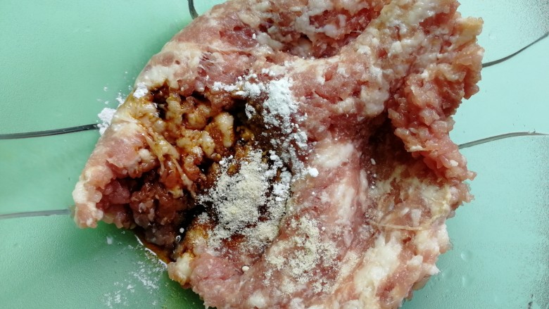 7. 加一点点葱姜水,顺时针搅拌,搅拌到葱姜水被肉馅吸收,再加一点点葱姜水,继续顺时针搅拌,直至肉馅上劲即可(无需用完全部葱姜水,看肉馅状态)