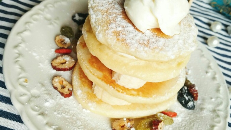21. 将制作好的松饼,撒上糖粉、果干、奶油做装饰。