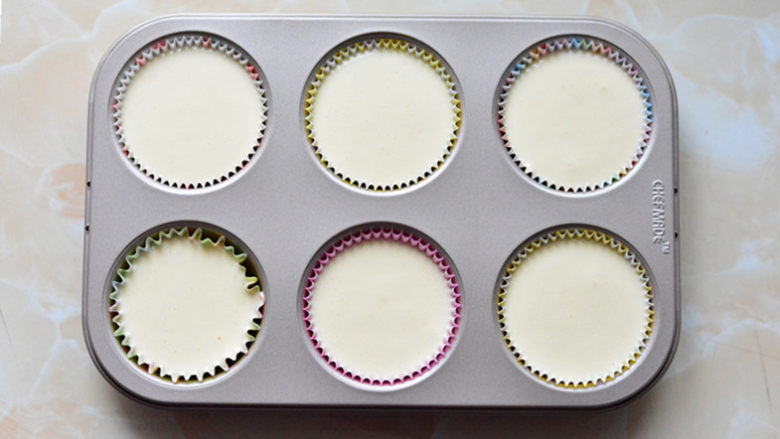 10. 装入六连模中九分满,还剩下一点点面糊,另外装了2个纸杯