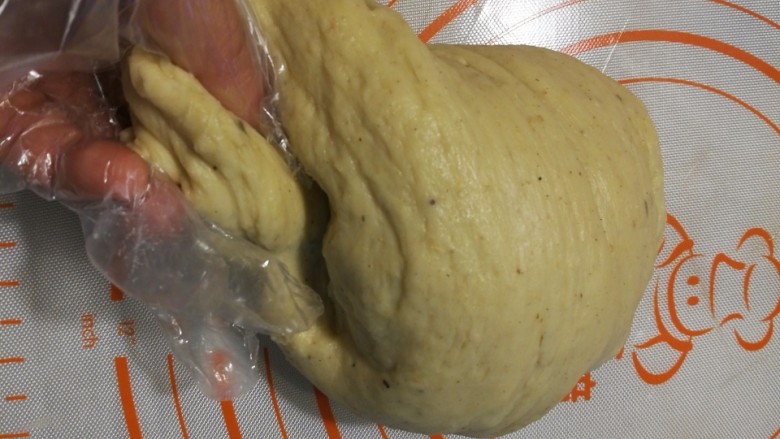 13. 重复摔打、揉面十几次,直至面团不沾手,可以拉成极薄的薄膜而不易断