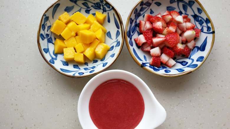 2. 将芒果去皮后切丁,草莓洗净后去蒂切成丁,草莓酱提前放冰箱冷藏。