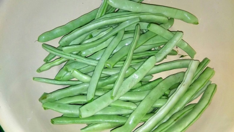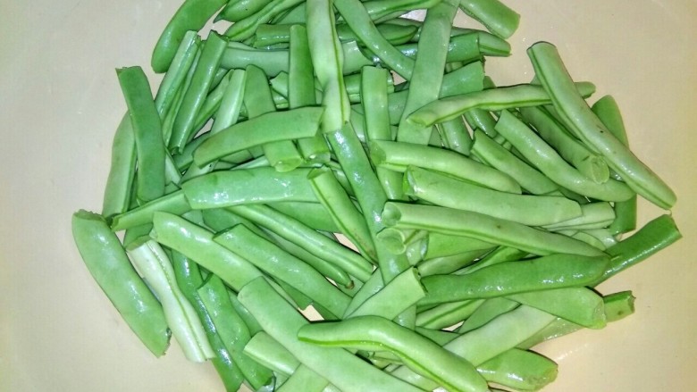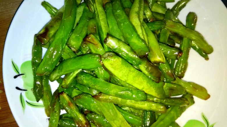 7. 炒锅烧热,放入适量植物油,油热,放入四季豆翻炒