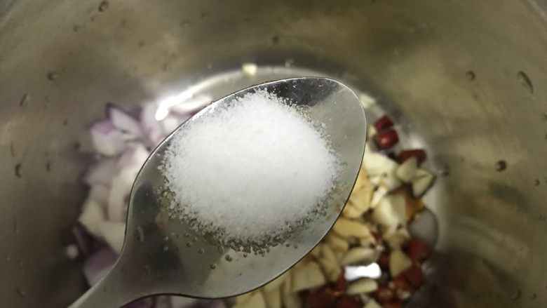5. 准备配菜,把紫洋葱切碎,蒜蓉,姜片,小米辣放入大盆。