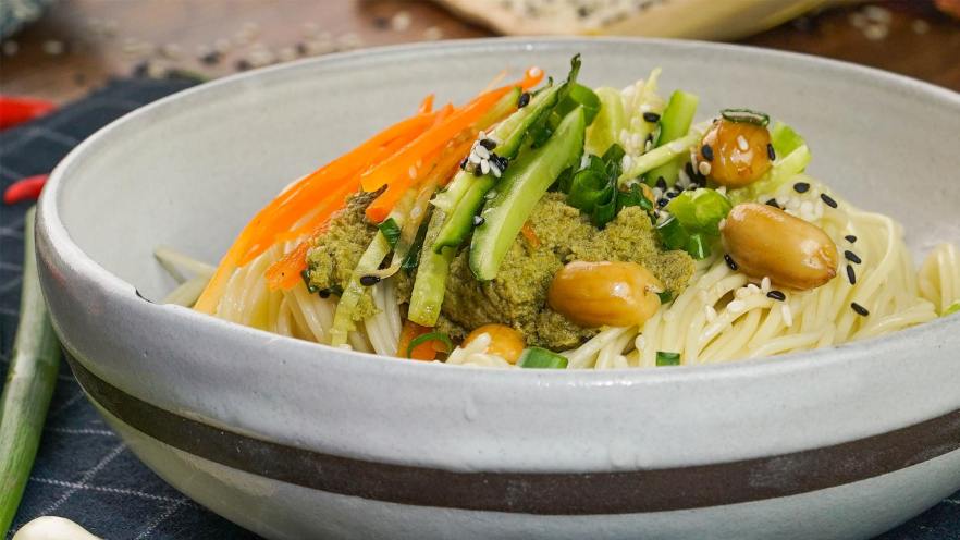 4. 面条1把放入沸水中煮熟,捞出过冰水,沥干装盘