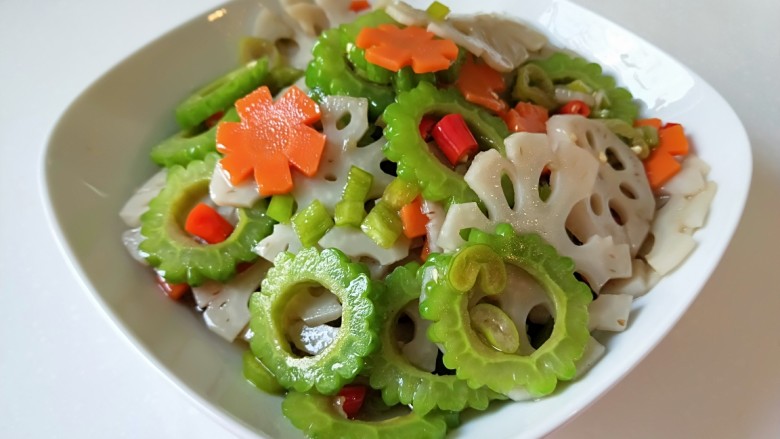 12. 胡萝卜片苦瓜片一起倒入盆中。