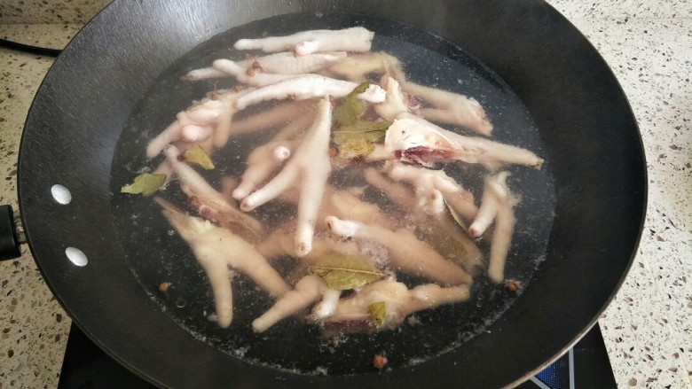 3. 煮熟的鸡爪过一遍冷水,洗掉浮沫,泡在冰水里(水是开水烧开放凉的,不能是自来水)