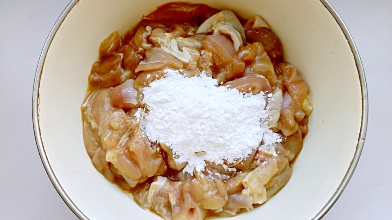 9. 准备工作基本做好了,就可炸鸡块了。炸鸡块之前在腌好的鸡块里加淀粉15克拌匀。