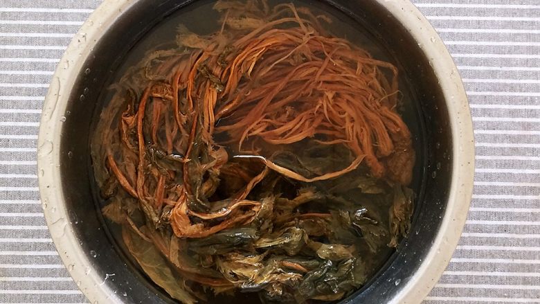 2. 梅干菜提前三个小时泡发,中途换水几次,将梅干菜中的杂质洗净。