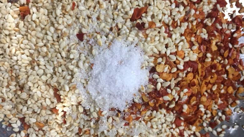 11. 空碗中加入辣椒粉、炒熟的白芝麻、盐、一丢丢糖、搅拌均匀