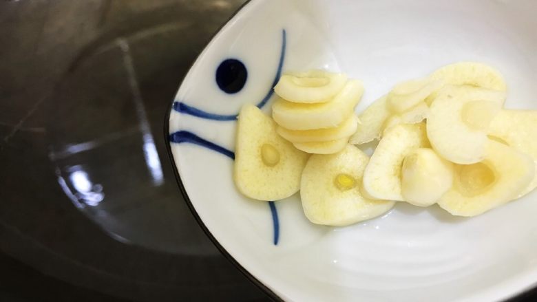 7. 大蒜去皮洗净,如图所示,切片,备用