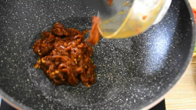 8. 倒入炒好的肉丝,继续翻炒。