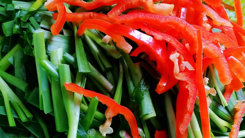 8. 放入韭菜红辣椒翻炒至韭菜变色