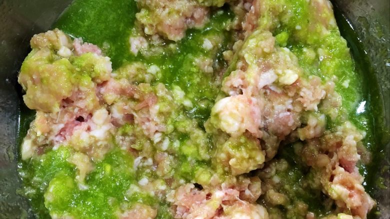 15. 把打好的葱姜汁 倒一半到猪肉馅中拌匀 (剩的一半一会拌肉皮冻用)