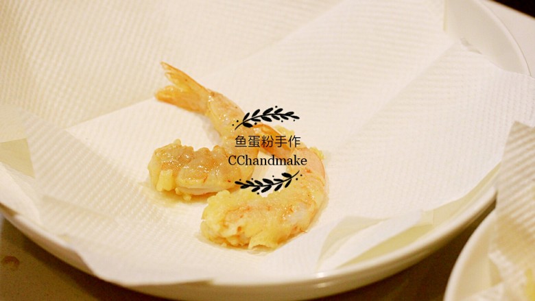 6. 捞出的天妇罗用厨房纸吸一下油,然后上碟,吃时蘸酱。
