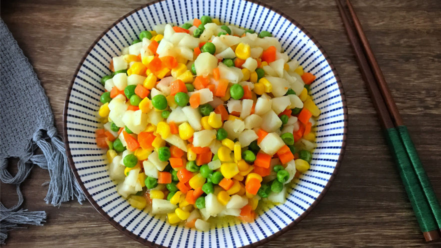 荸荠肉质洁白,味甜多汁,清脆可口,因生长在泥中所以又有“地下雪梨”的美誉,荸荠可生吃可入馔,用来做菜鲜美可口,鲜嫩带脆,黏中有甜,别具风味。这次就用荸荠和胡萝卜、玉米、青豆一起做了个菜,很是鲜美。